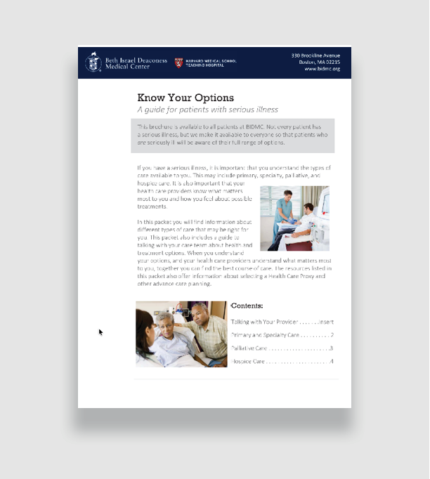 Conversation Ready. As a Communications Director at Beth Israel Deaconess Medical Center, I was the communications lead on Conversation Ready, part of the national campaign, The Conversation Project. Working with leaders across the medical center as well as patients and families, I produced videos, email updates, web content, posters, and handouts aimed at increasing communication and documentation about patients’ wishes for end-of-life care.